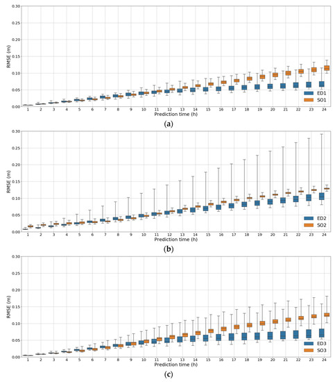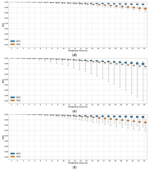 Figure 4 shows boxplots representing the results of each set of 20 ensemble learnings (obtained for making predictions) over a 24 h observation period. The figure shows the RMSE and NSE values for the LSTM SO1–SO3 and LSTM ED1-ED3 models using data obtained from 2 July to 23 September 2019. With the short-term predictions (approximately 10 h), no significant difference in the RMSE was observed, but the RMSE of the SO models increased as the predictions were generated over longer periods. This result was similar to that of a previous study [37].