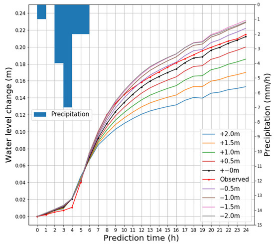 To examine the capability of our model to characterize the relationship between the simulated water level and the reservoir geometry, the changes in the water level from different initial water levels were computed. The rainfall data from 26 to 27 July 2019 (total rainfall of 16 mm, which is considered typical for the region) were used and computed using 0.5 m differences in the initial water level (Figure 5). The red and black lines represent the observed and simulated water-level changes, respectively. The other colored lines are the simulated water-level changes starting from the different initial water levels. The simulated water-level changes agreed with the observed water-level changes when the simulated and observed water levels were initially the same, and the results showed good reproducibility and accuracy. However, a small water-level change was predicted if the inflow started at a high water level, and a large water-level change was predicted if the inflow started at a low water level. The findings reveal that the LSTM ED models learned the relationship between the water level and water-level change and that, by knowing the cross-sectional geometry, they could estimate the inflow volume to the reservoir more accurately.