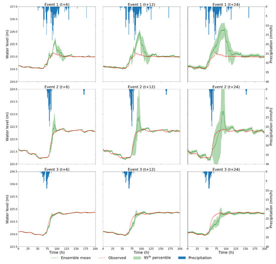 Observed and predicted water levels for the LSTM ED1 simulations at 6, 12, or 24 h in events 1 to 3. The 95th percentiles for the ensemble member predictions are shown with light green shading.