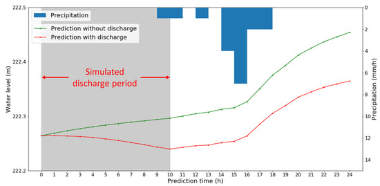 Figure 7 shows an example of the application of the LSTM ED model for different water levels, with or without a prior discharge before the rainfall event. The model provides helpful information regarding the timing and duration of discharge to enable rainwater collection without overflow from the reservoir. The model can quantitatively identify the effect of water discharge to increase the storage capacity before rainfall events occur.