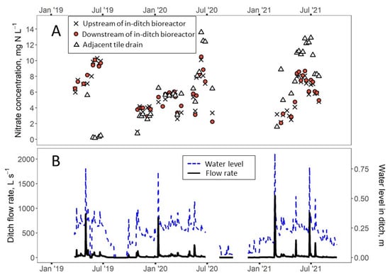 Nitrate removal by the in-ditch bioreactor was negligible, most likely caused by low hydraulic connectivity between the water column and the woodchips. Nitrate-N concentrations upstream and downstream of the in-ditch bioreactor averaged 5.9 ± 2.4 (n = 52, mean ± standard deviation) and 6.1 ± 2.2 mg N L−1 (n = 47), respectively, over the three-year monitoring period (Figure 2A). Nitrate-N concentrations downstream of the in-ditch bioreactor were not significantly less than upstream (paired Wilcoxon signed-rank test, one-sided, p = 0.99). Percent reduction in nitrate concentration across the in-ditch bioreactor averaged −1 ± 16%. This was lower than the 28% average reduction in nitrate concentration reported by Pfannerstill et al. for an in-ditch bioreactor in Germany []. Christianson et al. reported a nitrate concentration reduction of 65% at a 92 m long in-ditch bioreactor in Maryland [], although that bioreactor was more than five times greater in length. On many sampling dates, the slightly higher nitrate concentrations downstream of the in-ditch bioreactor may have been related to an intermittent contribution of nitrate from an adjacent tile drain discharging into the ditch between sampling points. Nitrate concentrations from this source (6.7 ± 4.0 mg N L−1, n = 44 samples) were significantly higher (paired Wilcoxon signed-rank test, one-sided, p = 0.007) than those in the upstream ditch.