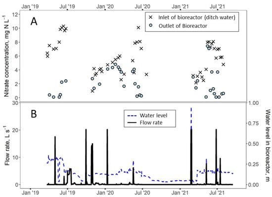 Nitrate concentrations at the bioreactor inlet (black ×, note these are the same as in Figure 2A) and bioreactor outlet (light blue circle) of the diversion bioreactor (A). Estimated flow rate (solid black line) and measured water level (dashed blue line) in the outlet control structure (B).