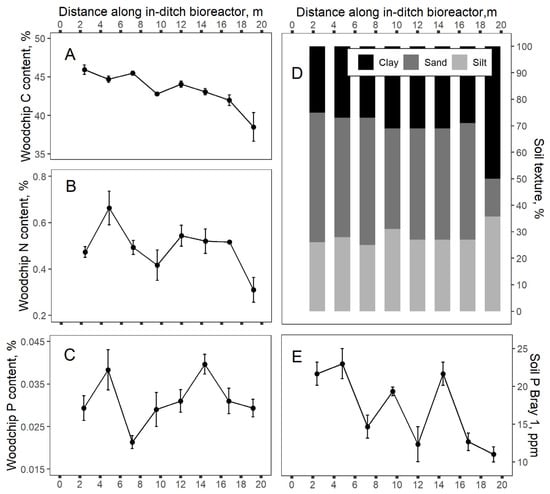 In-ditch bioreactor woodchip carbon (A), nitrogen (B), and phosphorus (C) content as well as soil texture (D) and soil Bray-1 phosphorus (E) taken from samples collected every ~2.4 m, along the in-ditch bioreactor 25 months after construction. Plotted points are the mean (n = 3) with error bars showing standard deviation for all analyzes except soil texture (n = 1).