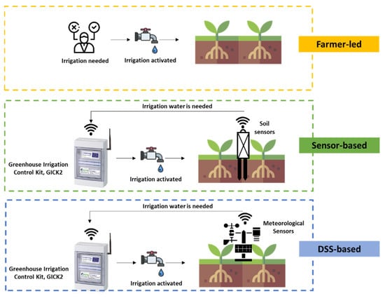 The irrigation empiric management normally adopted by the company, based on the farmer’s experience (hereafter referred to as “farmer-led”), was compared with two “smart” approaches for automatic irrigation scheduling (Figure 1): one based on the real-time soil moisture measurements performed by a wireless sensor network installed in the greenhouse, with automatic activation of the irrigation intervention when a certain pre-defined critical moisture set-point based on the hydrological characteristics of the soil was reached (hereafter referred to as “sensor-based”); another based on the calculation of the evapotranspiration performed by a commercial DSS, the BluLeaf® system (www.bluleaf.it, accessed on 12 December 2021), developed in its prototype form as part of a previous collaboration between CNR-ISPA and Sysman Progetti e Servizi Srl (hereafter referred to as “cloud-based DSS”). A layout of the field experimental setup is reported in Figure 1.