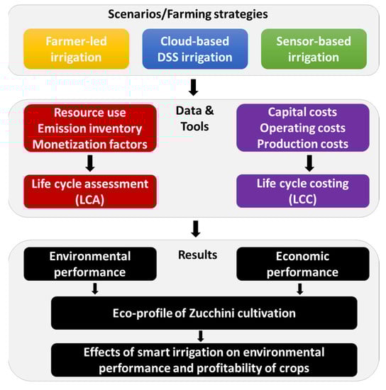 In this study, LCA and life cycle costing (LCC) were used to explore the environmental impacts and economic implications of water-efficient irrigation. A commercial cloud-based DSS (Bluleaf™) and an innovative sensor-based automatic irrigation management system were tested in greenhouse Zucchini (Cucurbita pepo L.) production, analyzed and compared to conventional irrigation management based on the farmer’s perception of crop needs. The aim of this paper is twofold. First, the results of this study provide a reference study on the multiple environmental impacts of zucchini using state-of-art life cycle impact assessment methods. Very few studies deal with the LCA of other greenhouse crops such as zucchini [,]. In recent years, there has been a significant increase in the production and consumption of zucchini in Italy. The country is the second-largest producer in the EU (with 37.1% of total production). As a result, we believe that a specific case study on Zucchini will be of interest to Italian and international stakeholders, as demand for lifecycle-based information and sustainably produced agricultural products is increasing []. Secondly, we answer: what are the effects of the proposed water-related innovations on environmental performance and profitability? There is a general lack of scientific publications directly linking smart farming to sustainability impacts [].