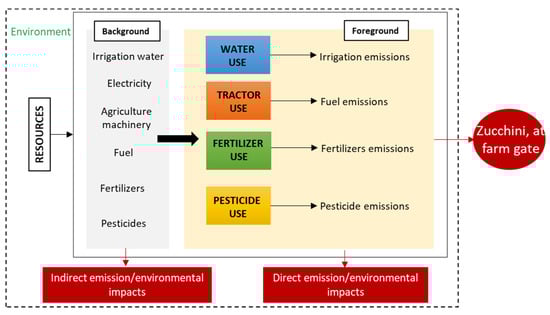 The analysis of environmental and economic impacts was conducted with life cycle assessment (LCA) and life cycle costing (LCC). Figure 2 shows a schematic of the main components of the life cycle impact analysis. We conducted both LCA and LCC based on a functional unit of 1-tonne zucchini using a cradle-to-farm gate perspective (Figure 3). Production and delivery of chemicals (fertilizers and pesticides), production and delivery of energy sources (electricity and diesel), and water were included. Primary input data was collected from a field investigation, as described in Section 2.1. The data is representative of a Mediterranean context. Field emissions regarding water emissions, soil direct and indirect dinitrogen monoxide, ammonia volatilization, nitrate leaching, and nitrous oxide were computed following LCA guidelines [,]. The management of the greenhouse facility (construction, maintenance, and disposal of pavilions or tunnels) was not included in the analysis.