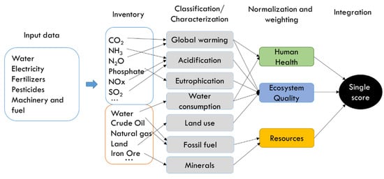 The impact assessment was conducted using the OpenLCA software v.1.10.3 [] and the ReCiPe 2016 (H) methodology []. The OpenLCA software was chosen for the project based on the authors’ prior experience and ease of accessibility. The ReCiPe 2016 life cycle impact model was chosen because it provides insightful information on a broad set of environmental impact categories and audiences. The analysis included eighteen midpoint indicators and three endpoint indicators (Figure 4). Global warming, freshwater, and marine eutrophication, terrestrial acidification, ozone formation, stratospheric ozone depletion, ionizing, radiation, water consumption, particulate matter formation, and land use are among the midpoint indicators. The three aggregated endpoint impact categories were damage to human health, ecosystems, and resources. Along with them, we use weighting factors to facilitate the establishment of an overall indicator of environmental impact. The single-figure scores assist the non-LCA expert in understanding the relative environmental performance of each strategy analyzed. The final impact was produced by using an average weighting set (Europe H/A, recommended): 400 human health, 400 ecosystem quality, and 200 resources. It means that the impact indicator value is multiplied by the weighting factor to obtain the single score value. The database Ecoinvent version 3.1 [], the most consistent and transparent life cycle inventory database, was used for life cycle inventory datasets of background processes (production of fertilizer, pesticides, electricity, and diesel).