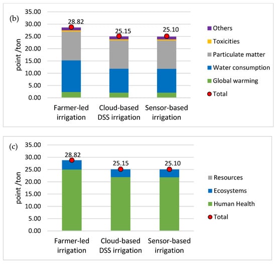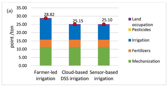 Looking at the process’s environmental single score results (Figure 5a), irrigation shares 35% to 42% of total environmental impacts. The main drivers of impacts (Figure 5b) are fine particulate matter formation (41 to 46%), water consumption (38 to 43%), and global warming (8.3 to 8.53%). These impacts are primarily driven by fertilizer production and emissions, followed by water and electricity consumption for irrigation. For damage impacts (Figure 5c), human health contributes most to the environmental single score, sharing more than 85% of the impacts. The results of LCA are consistent with previous studies highlighting that precision agriculture can have a positive impact on the environmental performance of crop cultivation.