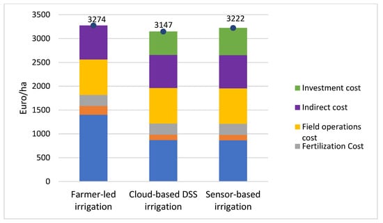 Figure 6 presents the direct production costs per 1 hectare of zucchini cultivation. The results are broken down by the different processes to facilitate the identification of the main contributors. The total cost of irrigation per hectare was 3274 EUR for farmer irrigation, 3147 EUR for DSS-based irrigation, and 3222 EUR for sensor-based irrigation systems (Figure 6). The costs per ton of product were 107.3 EUR, 103.2 EUR, and 105.7 EUR, respectively. The annualized cost benefits of precision irrigation via DSS and sensor-based were 127 EUR/ha (4%) and 105.7 EUR/ha (+1.6%), respectively. As is apparent from Figure 6, the water cost was the major cost component. The capital cost contribution is relatively small. They constitute 16% and 18% of total private production costs for cloud-based DSS and sensor-based management, respectively.