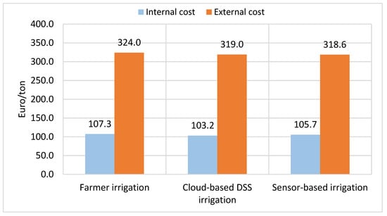 For the calculation of external costs, the environmental impact indicators presented in Table 3 were used. The total cost (the sum of the internal and external costs) was 431.4 EUR/ton for the farmer-led irrigation, 422.2 EUR/ton for the cloud-based DSS, and 424.3 EUR/ton for the sensor-based irrigation. The overall benefits in this study were 9.14 EUR/ton for the cloud-based DSS and 7.1 EUR/ton for sensor-based irrigation. The life cycle external environmental costs were estimated at 324 EUR/ton for the farmer-led irrigation, 319 EUR/ton for the cloud-based DSS, and 318.6 EUR/ton for the sensor-based irrigation. For smart irrigation strategies, we see a similar pattern since LCA performance was similar. Of the external costs, fertilizer is the predominant contributor. Hence, the limited benefits in terms of external environmental costs are because major LCA impacts are controlled by fertilization, which is the same among the three production systems. The results show that the external cost can be almost double the internal cost, while the economic benefits associated with the internal cost were found to be of higher relevance than external costs. There is no general agreement on external costs and their share of the total cost. Canaj et al. [] demonstrated that the external cost of crop production could range from 23–57% of the total cost. Olba-Zięty et al. [] demonstrated that the external cost of poplar chip production was 20% of the total cost, while Baaqel et al. [] that the total monetized cost of production accounting for externalities was more than double of the direct costs. Overall, our findings confirm the hypothesis that precision agriculture have generally a positive impact on farm productivity and economics []. The sensitivity analysis (Table 5) shows that the reduction of investment costs, higher water costs, and lower internal rate of return can enhance the profitability of smart irrigation strategies.