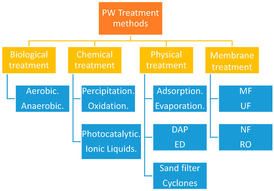 While reliable and effective, chemical treatment of wastewater and PW often uses toxic chemicals that presents secondary pollution problems. In addition, chemical treatment methods thus far discussed are cost intensive. In response to the afore-mentioned challenges, alternative treatment methods in the form of membrane treatment were researched and applied. Microfiltration (MF) [13], ultrafiltration (UF) [9], nanofiltration (NF) [9], and reverse osmosis (RO) are predominantly used in the water treatment industry. The application of the methods depends on the size of the pollutants to be extracted. Typically, MF is applied to remove suspended solids, while UF is used for the separation of macromolecules. The RO method is capable of separating dissolved solids and ionic compounds and NF is primarily applied for the extraction of multivalent ions [19]. Ciarapica [20] stated that membrane systems are capable of treating water high in oil content and can thus be suitably applied in offshore platforms. Figure 1 summarizes the various PW treatment technologies available for commercial application.