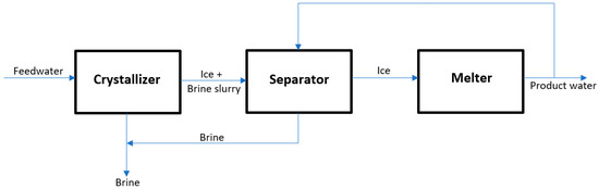 Although interest in FC can be traced back to 1786, the method has remained a subject of little practical application and was thought suitable only in regions of colder temperatures. The innovation of refrigeration machines revived a short-lived interest in the process and the availability of surplus energy bought forward by the crude oil industry in the 1970s shifted interest in the use of alternative water purification methods such as RO and evaporation. In more recent times, the application of FC, though limited to the food industry, has been regaining attention for more commercial applications. Figure 2 is used to depict a typical FC process flow.