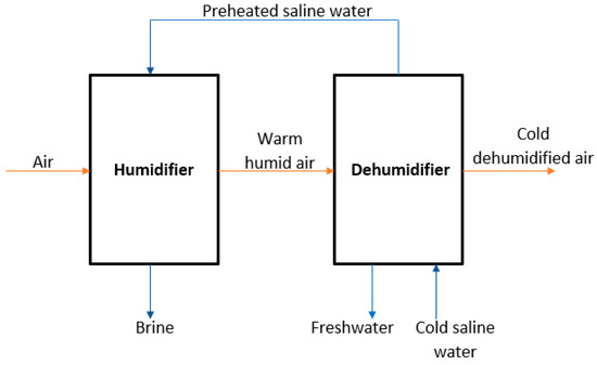 A simple HDH system primarily consists of a humidifier and a dehumidifier and its working principle is inspired by the natural rain cycle. To elaborate, the HDH relies on the ability of air to absorb and carry moisture from a water source. In this manner, in the humidifier saline water is brought in contact with air. The concentration gradient of water vapor between the air and water interface causes the diffusion of moisture into the air. The dehumidifier is then employed to collect freshwater from the air by means of condensation. The HDH system also requires the use of a heating medium. This then helps classify the system as water heated (WH) [43] or air heated (AH) [44] depending on the type of heating used for each stream. The heating medium plays a crucial role in the system as their thermal energy determines the amount of the pure water to be vaporized from the saline water. Generally, the capacity of the medium to vaporize freshwater increases with a rise in its temperature [45]. Figure 4 presents the schematics of a simple HDH cycle.