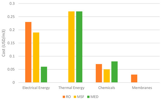 Thermal desalination is known to be the preferred method of procuring freshwater in many countries and in particular regions with adequate fossil fuel reserves. The technology adopted by these regions is predominantly multi-effect desalination (MED). MED, although considered a mature technology, is still under constant development and optimization to produce clean water at a cost-efficient rate and lowered energy consumption. It has been reported that a single MED unit can generate 8 Million Imperial gallons per day [88] of freshwater while providing a gain output ratio between 8 and 16 [89]. Despite the impressive production capacity, only 9% of the registered desalination plants employ the MED technology. Figure 6 and Figure 7 serve to provide a graphical comparison of the various desalination technologies against the MED process.
