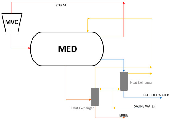 Among the several innovations suggested to the HDH process, mechanical compression of vapor is perhaps the most debated of them. HDH desalination integrated with vapor compression entails humidified air to be compressed to high pressures in order to elevate its pressure and temperature. Condensation of the water vapor present in the humidified air then occurs when the compressed air is cooled by the saline feedwater. The prime disadvantage associated with the mechanical vapor compression (MVC) method is its high-power consumption. El-Dessouky and Ettouney [86] claim that the power consumption of MVC may exceed that of single-effect MVC and RO processes without proper control and management. Limited research has been conducted on the potential of the HDH–MVC integrated system; however, the unexplored potential of an HDH–MVC system is highlighted through the advantages provided by a MVC unit integrated with a multi-effect desalination (MED) unit. Therefore, the following sections are dedicated to detailing the MED process and to presenting the benefits of an MED–MVC integrated system.