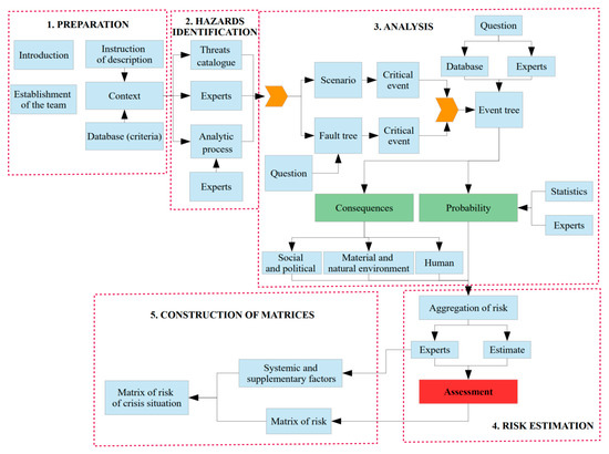 The risk assessment methodology described in this paper is a complex process that can be divided into five stages: preparation for risk assessment, hazard identification, processes related to risk analysis, risk estimation and illustrated assessment in the form of two matrices with criteria [24]. The different stages of risk assessment consist of many semi-dependent steps, which are presented in Figure 1.