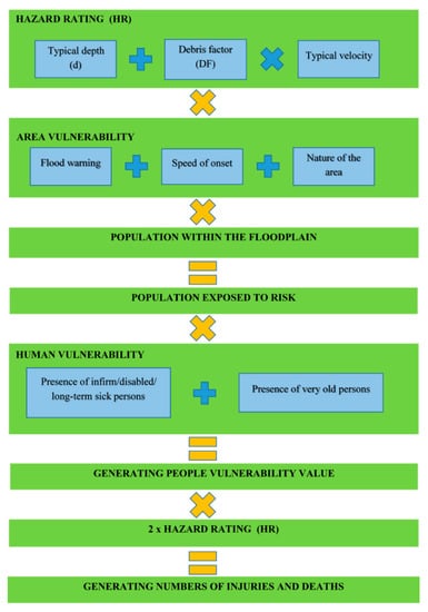 In the risk assessment process, it is important to find and appoint methods that will help in a more accurate way to assess the hazard effects. Following this assumption, in order to estimate the number of deaths and injuries, the method described in [31] was used in this work and implemented as the methodology of risk assessment for crisis management. The overall estimation scheme of the method is shown in Figure 2. Based on the methodology, there are three main sets of characteristics that determine the degree of flood consequences [31]: