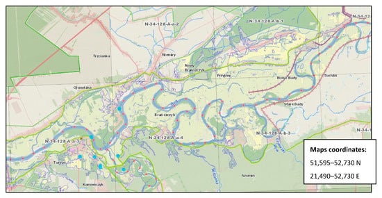 For the municipality of Brańszczyk, ISOK sheets (N-34-128-Aa-3, N-34-128-Aa-4, N-34-128-Aa-2, N-34-128-Ab-1, N-34-128-Ab-3, and N-34-128-Ab-2) were used, available from [37] (see Figure 4). During the assessment, the assumption was made of the most severe consequences that were still possible according to the “worst scenario” rule. This assumption resulted in scenarios with a flood probability of 0.2%, or once every 500 years, according to accepted ISOK simulations or a scenario of interruption of shafts.