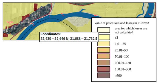 In order to calculate the material losses incurred as a result of floods, the same ISOK maps should be used as for the assessment of human losses (see Figure 5). To calculate the value of losses, it was necessary to estimate the area of flooded areas whose potential material losses were <1, 1.01–25, 25.01–50, 50.01–100, 100.01–150, 150.01–300, and >300 PLN/m2. For example, the estimated area of the commune Brańszczyk affected by flood is approximately 5,156,900 m2, which provides the results shown in Table 8.