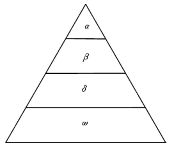 Grey wolves belong to the Canidae family and are considered apex predators. They have a very strict social hierarchy, which is generally divided into four levels, as shown in Figure 1. The first layer of the pyramid comprises the leader in the population, called α, which is mainly responsible for the management of all the wolves. The second layer is called β, and comprises subordinate wolves that assist the α in decision-making or other pack activities. The third layer is δ, it comprises wolves that submit to decisions and orders from α and β, but they dominate the wolves in the lowest layer. At the bottom of the pyramid is ω, which comprises wolves that are mainly responsible for the balance of internal relations of the population.