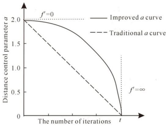 According to the GWO, the coefficient vector can balance local search and global search. If , the search range will increase, which is conducive to global search. If , the search accuracy is strengthened, which is conducive to local search. In Equation (3), is a random number in the range [0,1], hence the parameter determines the size of and plays a key role in the exploration and exploitation. The larger the value of , the stronger the exploration ability of the algorithm; the smaller the value, the higher the search accuracy. In the GWO algorithm, , where tmax is the maximum number of iterations. In this study, a distance control parameter calculation method based on a circular formula is proposed; specifically, . The variation of a with the number of iterations is shown in Figure 2.