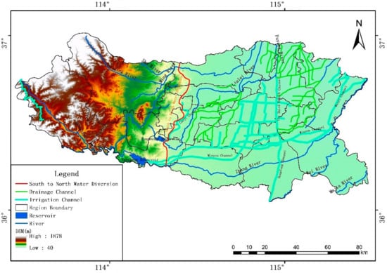 Handan is located in the southern part of Hebei Province, China, and has a history of 3100 years, as shown in Figure 3. The population of the city is approximately 9.414 million. In addition, the area of this region is 12,047 km2, in which the mountainous and plain regions cover areas of 4460 km2 and 7587 km2, respectively. Handan has a temperate, semi-humid, and arid continental monsoon climate. The annual average temperature is approximately 12.5–14.2 °C, and the annual average precipitation is 537.6 mm, which is concentrated from June to September. The main rivers in the territory are the Fuyang River, Zhanghe River, Weihe River, Minghe River, LiuLei River, Laozhang River, Laosha River, and Majia River. The per capita water resource in Handan is 118 m3, which is a resource-based water shortage area. Moreover, with the rapid economic development, the shortage of water resources has become the main factor that restricts and limits sustainable economic development and ensures the safety of water use.