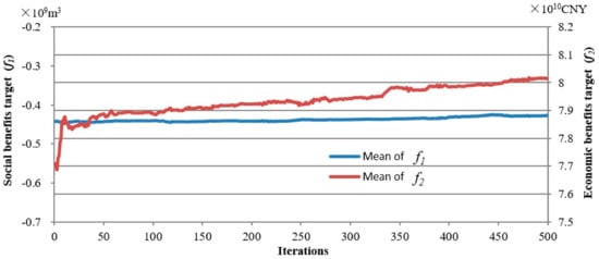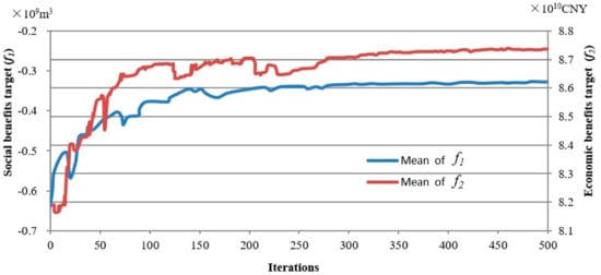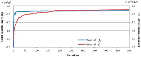 In this study, AMOGWO was used to solve the multi-objective optimal allocation model of water resources in Handan. The population number was 1000, and the number of iterations was 500. MATLAB was used as a solution tool to obtain the Pareto front. Figure 4 shows the iterative process of the individual average value of the AMOGWO algorithm swarm. It is apparent that the iteration curve of the individual average value of the social benefit objective function and the economic benefit objective function tends to converge at approximately 180 iterations. After 180 iterations, it fluctuates within a small range but exhibits a stable trend. The AMOGWO algorithm has a fast convergence speed.