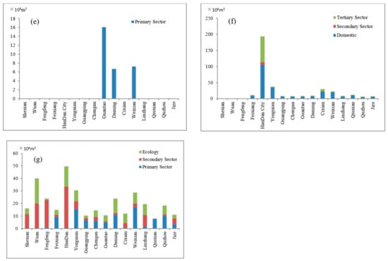Figure 5a shows the allocation of different water sources to each subregion in Handan. The available water supply of local surface water is 345.57 × 106 m3, and the actual water supply is 172.04 × 106 m3. The supply object includes two water users—primary sector and ecological—where 147.72 × 106 m3 water is supplied to primary sector and 24.32 × 106 m3 for ecological environment. Meanwhile, the remaining available water supply is 173.53 × 106 m3, which is concentrated in Shexian (77.65 × 106 m3), Fengfeng (82.84 × 106 m3), and Cixian (13.04 × 106 m3).