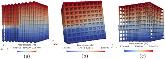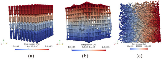 A comparison among three PNM for studying the effect of connectivity. (a) includes only unidirectional channels. (b) is fully connected. (c) is contrary to (b) in terms of pore and throat size. ϕ are 18.81%, 49.48%, and 17.76%, respectively. K are 1.02 × 10−11 m2, 1.09 × 10−11 m2, and 1.05 × 10−12 m2, respectively. Color bar represents pressure distribution.