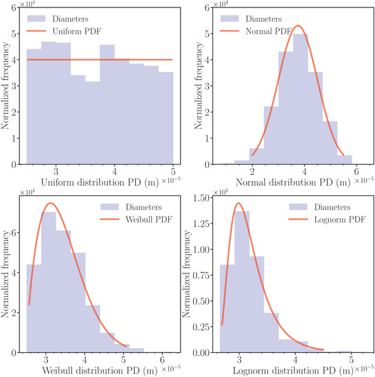 In model set 3, pore diameters are randomly generated according to 4 probability density functions (PDF), including uniform distribution, normal distribution, Weibull distribution, and log normal distribution. Figure 3 shows the four PDFs, among which Weibull and log normal distribution are two kinds of right-skewed distributions. Throat diameter is determined based on the diameters of its connected pores in three ways: min, mean, and max. “min” means that throat diameter is calculated as the minimum of diameters of its connected pores and “mean” and “max” means average and maximum, respectively. PCN is the same as model set 1. Besides, two pore diameter ranges are used for PNM design: 2.5 × 10−5 m–5.0 × 10−5 m and 1.0 × 10−6 m–1.0 × 10−4 m. Combining four pore diameter generation schemes, three throat diameter generation schemes, and two pore diameter ranges, 24 basic PNM are obtained. In order to exclude chance factors embedded in the random pore diameter generation process, 100 repeated constructions are performed for each basic PNM. As a result, 2400 PNM are constructed. In model set 4, all the settings are the same as model set 3, except that PCN of model set 4 is 6. Figure 2b shows a random fully connected PNM in model set 4, in which pore diameters range from 1.0 × 10−6 m to 1.0 × 10−4 m.