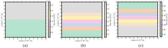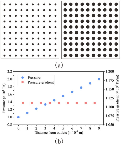 As mentioned in Section 2.3, the blank control group consists of four PNM. Pressure distribution, inlet flow rate, and permeability are obtained from the simulation results. It should be noted that half of each boundary pore is not considered for the calculation of pressure distribution because of the boundary effects, which means that the actual flow domain length is 9 × 10−4 m. Figure 4a shows the cross-section view of the two unidirectional control PNM. Figure 4b shows the pressure distribution within the four PNM.