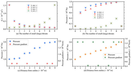 Variations of permeability and pressure distribution according to the configuration of small (large) pores and throats. (a,b) variations of permeability and pressure according to the number of small (large) throats. (c,d) pressure distribution along flow direction within the PNM shown in Figure 2a and its contrary PNM in terms of pore diameters.