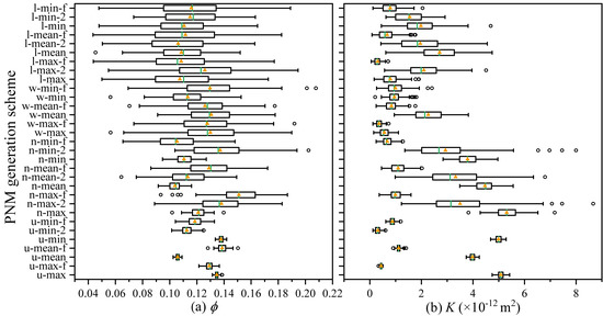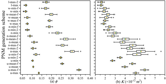 Permeability of type 1 models is the result of the synthetic effect of porosity, PSD and PCN, so it is difficult to distinguish the contribution of throat size. Then, in type 2 models, pore diameter range is larger than that in type 1. Parameters of the four PDFs are also adjustable for the control of porosity. The average, first quartile, and third quartile of porosity are fixed in the range of 10–15%. According to Figure 9a, this method is practicable. Equal porosity means that fully connected PNM should consist of smaller pores and throats compared to unidirectional PNM because the increasing throat number should be compensated by smaller throats for the conservation of ϕ.