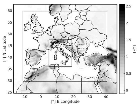 Within the project, CIMA Research Foundation is running a Weather Research and Forecasting (WRF) model with different configurations and twice-a-day updates (00 and 12 UTC), able to provide forecasts up to 48 h at hourly temporal resolution. The model has a European coverage and three nested domains of 22.5, 7.5 and 2.5 km resolution (Figure 1).