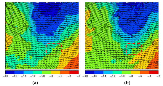 Figure 2. ECMWF HRES analysis: 500 hPa geopotential height (dm, contours), temperature (°C) and wind (barbs) at 12:00 UTC (a) and 15:00 UTC (b) on 15 July. The red dashed box identifies the position of Sicily.