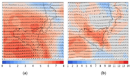 Figure 3. Specific humidity (g/kg) and wind (barbs) at 700 (a) and 850 (b) hPa at 15:00 UTC. ECMWF-HRES forecast (+3 h) starting on 15 July 12 UTC.