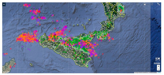 The significant convective activity over the Island is also confirmed by the lightning strikes detected by the Italian Air Force Meteorological Service (LAMPINET) from 13 to 16 UTC (Figure 4). It is worth mentioning that, during that day, the weather radar located in Sicily was not working due to technical problems (Figure 5).