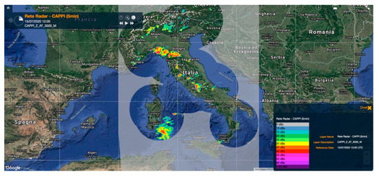 Figure 5. CAPPI (Constant Altitude Plan Position Indicator) radar measurement at 3000 m of 15 July 2020 12:00 UTC. Most of Sicily is covered by a light grey, which corresponds to missing data. Image obtained from my DEWETRA platform, courtesy of the Italian Civil Protection Department.