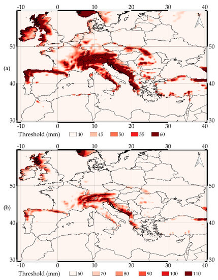 The rainfall thresholds currently applied by ERDS to WRF data, obtained with the methodology described in Section 2, are shown in Figure 6. For the 24 h interval, the best results were achieved using the threshold mask characterized by p = 5%, a lower bound equal to 40 mm and an upper bound equal to 60 mm. For the 48 h interval, instead, the selected mask has p = 6%, lower bound equal to 60 mm and upper bound equal to 110 mm.