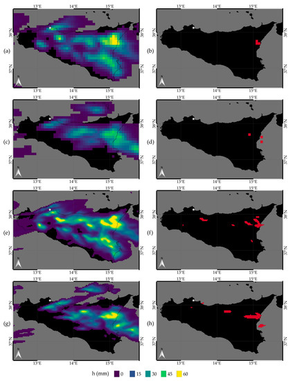 This thresholding approach is not new: many meteorological hazards (such as rainfall, flooding, landslides and temperature) are currently detected, analyzing the probability of overcoming thresholds that are defined on the basis of historical measurements recorded over a given area [7,17,18,19,20,21]. In our case, this analysis is performed using threshold values that are both space-dependent (each pixel has its threshold value) and time-dependent (each rainfall duration has its threshold value).