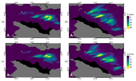 Figure 8a shows the rainfall depth at 2.5 km resolution forecasted from 12 to 16 UTC by the WRF model experiment on the 15 July at 12:00 UTC using only the weather radar data assimilation and serves as a reference. Figure 8b shows the same forecast, obtained with data assimilation of weather radar data and hygrometers: higher rainfall depths were forecasted not too far from the Palermo area, over the sea, in the northeast direction. Anemometers were used in place of hygrometers in the simulation shown in Figure 8c. Unfortunately, the inclusion of these data reduced the rainfall depth forecast. The final test, conducted by assimilating weather radar data and anemometer, hygrometers and thermometers, is instead reported in Figure 8d. This final test produces the best forecast, even if an underestimation is still present. It results in the prediction of around 50 mm of rainfall in 3 h less than 30 km far from the most affected area (Figure 8d). This value, if analyzed using the approach applied by the Italian Civil Protection Department, would support at least a yellow alert over Palermo.