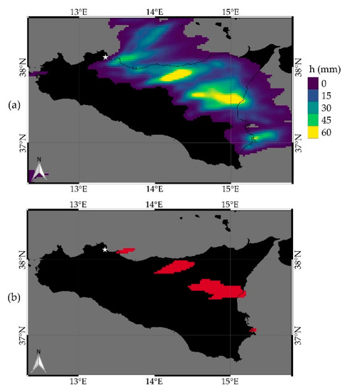 In addition, the Extreme Rainfall Detection System would also issue an alert by thresholding the 48 h rainfall depth values. Figure 9a shows the 48 h rainfall depth provided by the WRF model, while Figure 9b shows the alerts issued by ERDS: a cluster of pixels with rainfall depths higher than the pluviometric threshold is visible about 15 to 30 km far from Palermo (red areas).