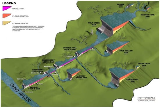 Five projects on the Cumberland River mainstream are maintained and operated by the U.S. Army Corps of Engineers Nashville District, plus five other projects on the tributaries. The mainstream projects are the Cordell Hull, Barkley, Cheatham, Old Hickory, and Wolf Creek. The U.S. Congress has authorized Barkley, Cheatham, Old Hickory, and Cordell Hill for hydropower generation and commercial navigation. The five Corps of Engineers tributary projects, Dale Hollow, Center Hill, Martin’s Fork, Laurel, and J. Percy Priest, are congressionally authorized for flood risk management [21,22].