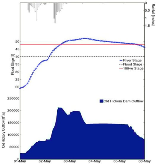 Discharge at the Old Hickory Dam, and flood stage at the Nashville, TN, USA gage as a function of time during the 29 April–7 May 2010 event. [21].