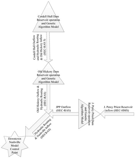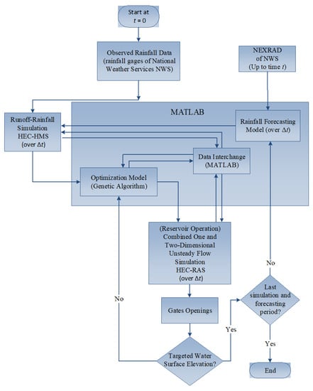 Figure 5 illustrates the over model structure and interconnection of the model components. The optimization/simulation model includes four individual simulation models interfaced through MATLAB that make up the larger simulation model as follows: a short-term rainfall forecasting model, a rainfall-runoff model (HEC-HMS), a one- and/or two-dimensional unsteady flow simulation model (HEC-RAS), and a reservoir operation model, and also illustrates the interconnection of the simulation models, and the genetic algorithm for the solution of the optimization model.