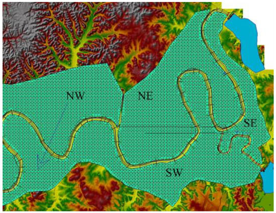 Three scenarios were adopted to simulate the unsteady flow for the May 2010 flood event. The first scenario uses combined one- and two-dimensional unsteady flow modeling, in which the Cumberland River, Nashville, TN, USA, reach has been model using the one dimensional model, whereas its flood plain was modeled using two-dimensional unsteady flow simulation. The two-dimensional area was divided into four sub regions, two on the north side of the river reach, and two on the south side, and as NE, NW, SE, and SW, as shown in Figure 7. These sub-areas were gridded into 832, 1068, 235, and 1208 cells, respectively. The total area of these cells that cover the two-dimensional modeling is around 106 square miles. The input spacing into the 2D flow area editor for the generation of cells is 1000 feet × 1000 feet.