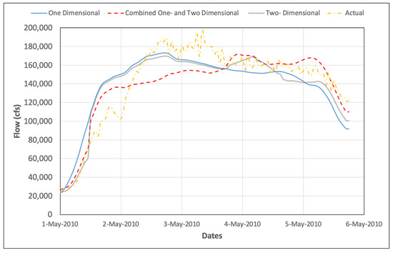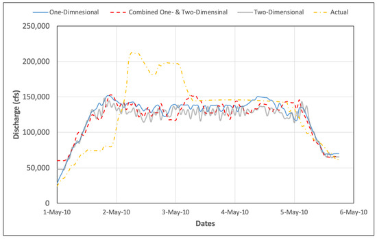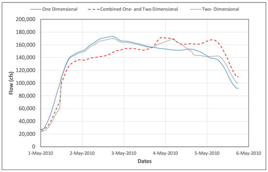 Contrary to expectations, the two-dimensional simulation model linked with the optimization model resulted in peak discharges that did not exceed 169,694 cfs during the entire period of simulation of the May 2010 storm event. This two- dimensional unsteady flow model ran faster than the combined one- and two-dimensional model, so the optimization model had more time to improve the solution. The reason why the previous model is slower than this one is because of the connection between the two-dimensional and one-dimensional areas, which is modeled as very long lateral structures.