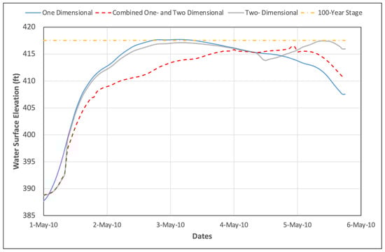 Figure 12 compares the optimized discharges at Nashville for the May 2010 flood event of each of the three unsteady flow modeling approaches. Each of the three optimized discharges for the unsteady flow routing models at the gaging stations are below the 100-year water surface elevation, but not the discharge of 172,000 cfs. However, the peak discharges from the simulations were 172,907 cfs for the 1D simulation, 171,792 cfs for the combined 1D and 2D simulation, and 169,682 for the 2D simulation approach.