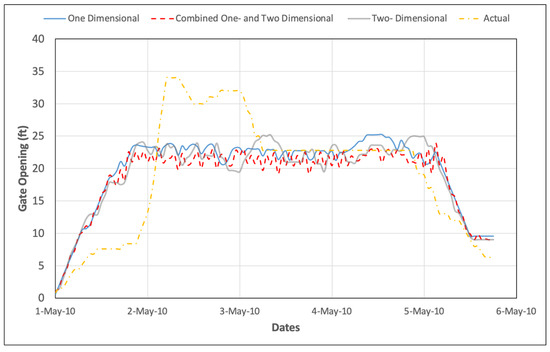Figure 14 illustrates the differences between the optimized operations of flood gates at Old Hickory, which were all opened the same distance, as compared to the actual operations, which were all opened at the same distance. Obviously, the actual USACE operation of the gates waited too late to start opening the gates, resulting in peak gate openings of 34 ft as compared to optimized maximum gate openings of 25.23 ft for the 1D simulation, 25.2 ft for the combined 1D and 2D simulation, and 23.9 ft for the 2D simulation.