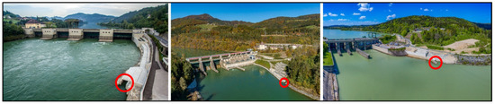 Study sites: Hydro Power Plants (HPP) Lavamünd (left), Schwabeck (middle) and Edling (right), situated at river Drava, Carinthia/Austria. Red circles indicate the entrances of the fish passes.